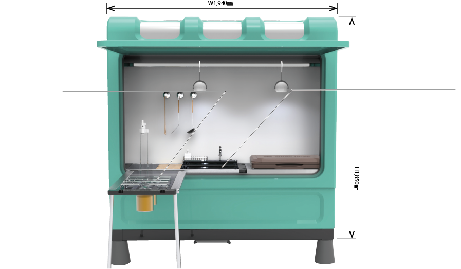 CAMPitのある空間は、プライベートなキッチンスペースやトイレが用意されているキャンプスタイル。共有空間では味わえないプライベート使用のため混雑や汚れを回避でき、感動するほど快適です。個別の水回りがキャンプサイト付近にあるということは、それだけで特別感が全然違います。こちらのユニットのサイズ感は軽トラのキッチンカーとほぼ同様(本体サイズ:W1430×D1940×H1850mm)。ストレスフリーなキャンプを心置きなく楽しんでもらえます。