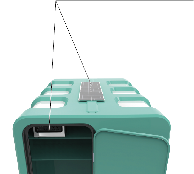 CAMPitで使用する(シンクやトイレ、クーラーボックスの使用時に手元を照らしてくれる灯りや、トイレのラップポン、それに上水のポンプ)電源はポータブルバッテリー(オプション。1泊2日利用時400Ah以上推奨)のDCシガーソケットとAC100Vコンセントに接続する仕様です。またポータブルバッテリーの補助充電としてソーラーパネルの設置も可能です。(オプション)
